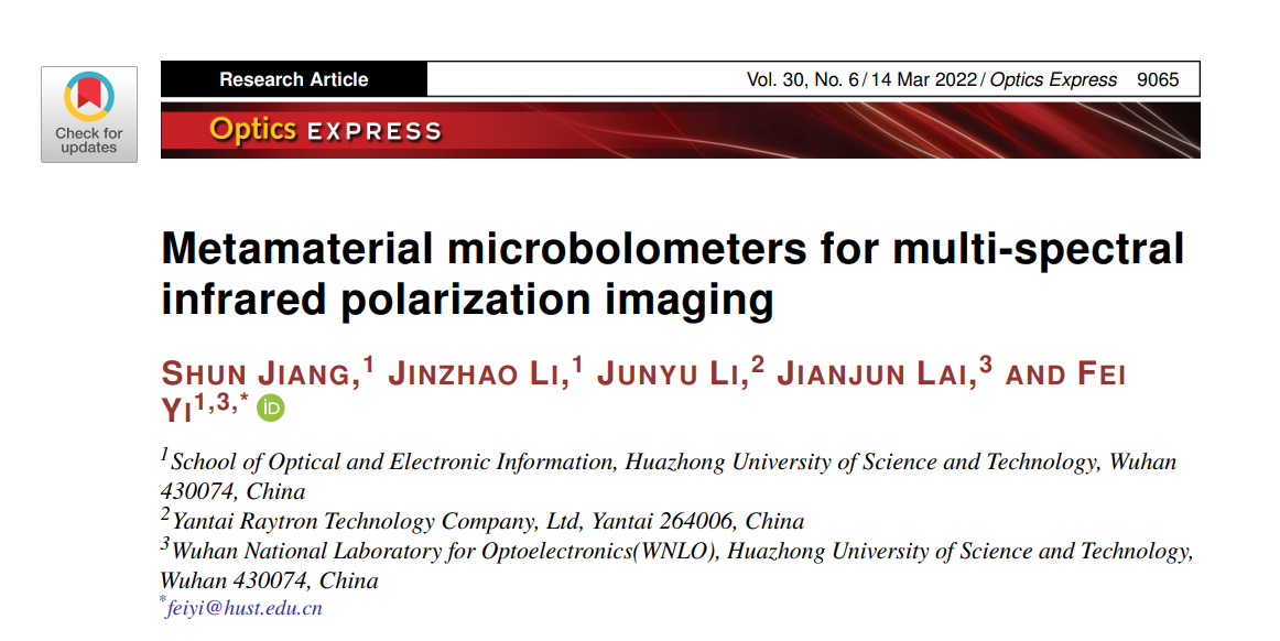 近日,公司易飞副教授课题组关于超表面集成式微测辐射热计研究成果发表在光学领域重要期刊Optics Express(影响因子3.894),题为“Metamaterial microbolometers for multi-spectral infrared polarization imaging”,公司为论文第一和通讯单位,博士生蒋顺为论文第一作者,易飞副教授为论文通讯作者(详见https://doi.org/10.1364/OE.452981)