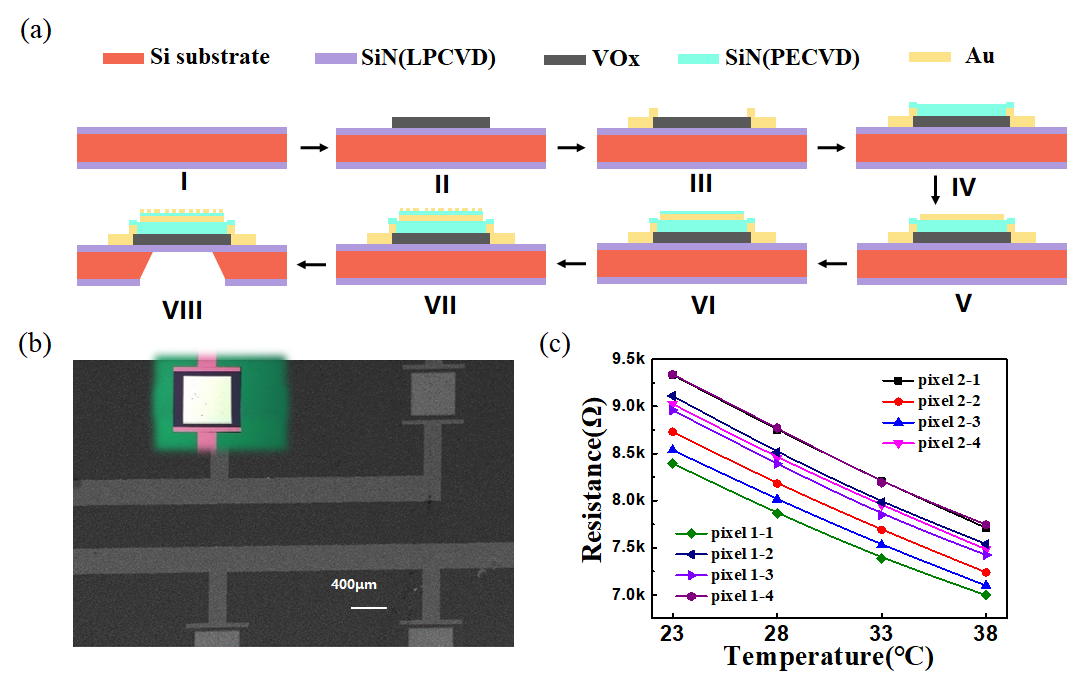 接下来开展了该超表面吸收体与传统微测辐射热计像元的工艺集成,主要工艺步骤如图2(a)所示。主要使用到的工艺为镀膜(电子束蒸发、PECVD、离子束溅射等)、刻蚀(ICP等)、图形化(光刻、电子束曝光等)。其中关键的热敏层材料由武汉光电国家研究中心赖建军教授团队协助制备。图2(b)显示了制备好的像元的SEM图和金相显微镜照片。图2(c)为8个像元的电阻随温度的变化特性,其中电阻温度系数都大约为-0.012。