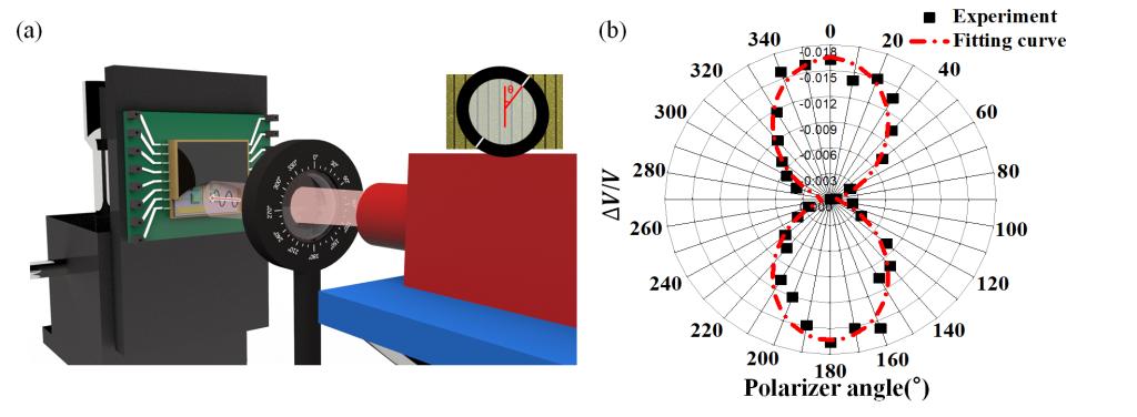 最后对探测器进行了封装和测试,图3展示了光谱特性的测量,测试的响应率与该探测器的吸收曲线吻合良好,两个波段的探测器分别实现了1.00V/W和1.46V/W的峰值响应率。图4展示了偏振特性的测量,测试数据与理论预测曲线吻合良好。该结果表面,制备的探测器拥有了超表面吸收体的光谱和偏振选择能力,并且获得了极高的集成度。该成果有望推动超表面与传统探测器结合的进一步研究,实现新型的功能,为未来商用探测器的性能优化提供了新的发展方向。