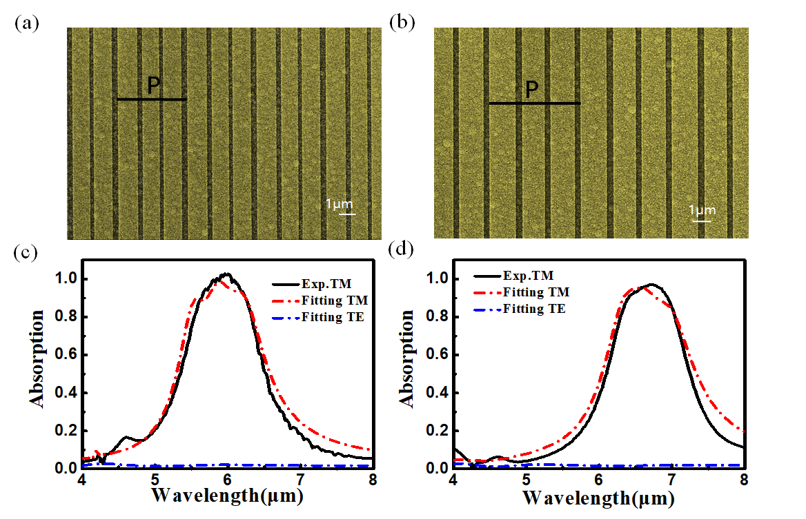 在该团队的前期工作中(详见https://doi.org/10.1364/OE.397868),实现了常规的3μm~5μm和8μm~12μm双波段的偏振选择超表面吸收体的设计。在本论文中,为了适用量子级联激光器(Quantum Cascade Laser,QCL)的工作波段,即5.3μm~6μm,重新设计了该工作波段附近的双波段偏振选择超表面吸收体。如图1所示,分别实现了5.150μm~6.422μm之间0.8322的TM模式平均吸收系数和42.24的偏振消光比,以及5.867μm~7.467μm之间0.7720的TM模式平均吸收系数和42.65的偏振消光比。并通过电子束蒸发、电子束曝光等工艺进行了工艺制备。