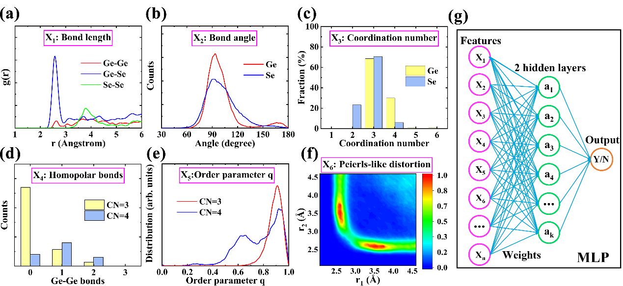 研究团队利用第一性原理计算建立了数百个非晶态GeSe材料的模型,由于缺陷态具有随机性,从中选取约50个具有缺陷态的模型,且选择了共1000个原子作为样本,并提取了短程和中程范围的结构特征来训练神经网络(见图2)。这些结构特征包括键长、键角、配位数、同极键、序参数q和Peierls-like扭曲分布。通过组合这些局部结构特征作为输入数据集,利用多层感知器(MLP)来进行有监督学习。MLP由输入层、隐藏层和输出层三部分组成,其中输入层由特征数据集与标签数据组成。每个隐藏层中的神经元将前一层的值转换为加权线性和,然后传递到一个非线性激活函数。这里设置了两个隐藏层,输出层接收最后一个隐藏层的值。将整个输入数据集分为训练集(80%)和测试集(20%),利用训练集来训练MLP模型,然后利用测试集和交叉验证方法测试模型的准确性。经过多次训练与参数优化,最终神经网络的识别准确率可达95%以上,可以很好地预测非晶态模型中缺陷态的产生。