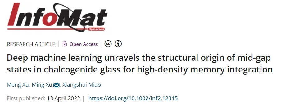 MengXu, Ming Xu*, Xiangshui Miao,Deep Machine Learning Unravels the Structural Origin of Mid-Gap States in Chalcogenide Glass for High-Density Memory Integration, InfoMat, 2022, DOI: 10.1002/inf2.12315