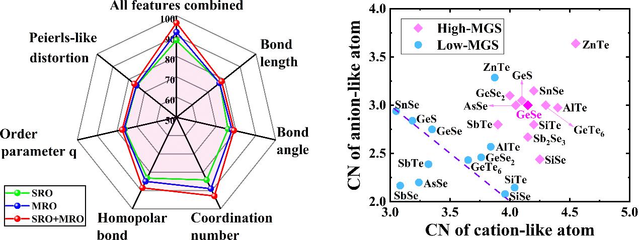 为了确定各种局部结构特征与缺陷态的相关性,分别利用单一的结构特征作为输入来重新训练MLP模型,计算相应的识别率,确定了其中配位数和同极键可能是导致缺陷态的主要原因,而且中程结构的相关性高于短程结构。进一步研究表明,在非晶态GeSe模型中,4配位的Ge原子和3配位的Se原子组合形成团簇的时候,整体上违背了8-N规则,产生了过剩的电子,最终导致产生了高度局域化的缺陷态。随后计算了不同OTS材料中的配位数分布,发现其中产生缺陷态的结构团簇都具有更高的配位数,说明打破全局8-N规则的中程团簇结构是不同OTS材料中缺陷态的主要来源(见图4),这一结果也为筛选新的OTS材料提供了依据。