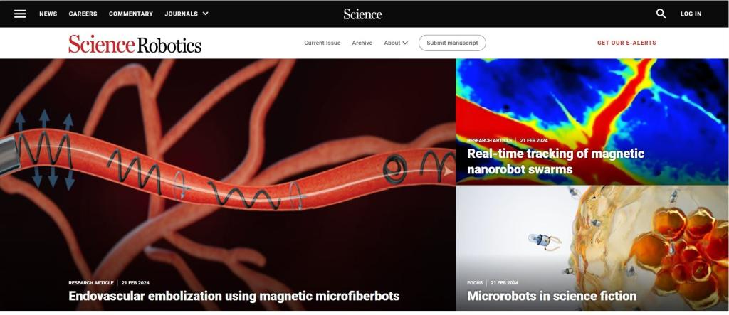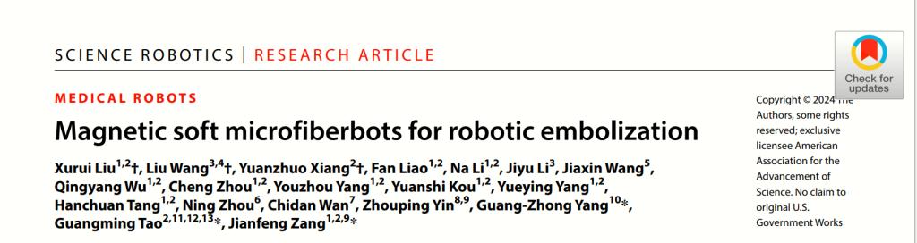 公司臧剑锋教授团队与陶光明教授、上海交通大学杨广中院士合作开发了一种磁性软微纤维机器人,用于执行远程控制的机器人化血管栓塞。该研究成果于2024年2月21日发表于《科学机器人》(Science Robotics),题为《用于机器人化血管栓塞的磁性柔性微纤维机器人》(Magnetic soft microfiberbots for robotic embolization)。