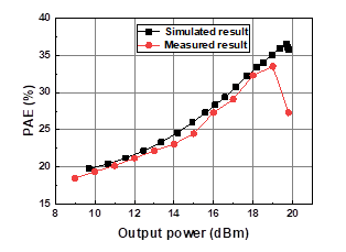 当反相C类GC开启时,6 GHz频段的2/3次谐波抑制提高了13 dB/6 dB,在13 dBm输出功率下,谐波抑制性能达到41.8 dBc/39.1 dBc。当反相C类GC开启时,输出1 dB压缩点提高1 dB,OP1dB为19.2 dBm;饱和输出功率提高0.9 dB,为19.43 dBm。在输出功率约为19 dBm时,峰值PAE为33.6%。与现有技术相比,所提出的DPA在实现宽带宽的同时,具有最高的峰值PAE、相邻通道功率比(ACPR)和2/3次谐波抑制比。