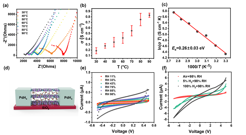 通过电化学阻抗谱(EIS)实验,研究团队进一步验证了该薄膜的质子传输行为。在90°C和98%相对湿度条件下,该薄膜的质子电导率达到了0.83 S cm−1,同时展现出低至0.26 eV的激活能,证明了其作为质子导电材料的卓越性能。实验结果显示,随着温度的升高,薄膜的质子电导率显著增加,从30°C时的0.19 S cm−1上升至90°C时的0.83 S cm−1,这表明温度升高能够有效降低质子传输的势垒,提升传导效率。