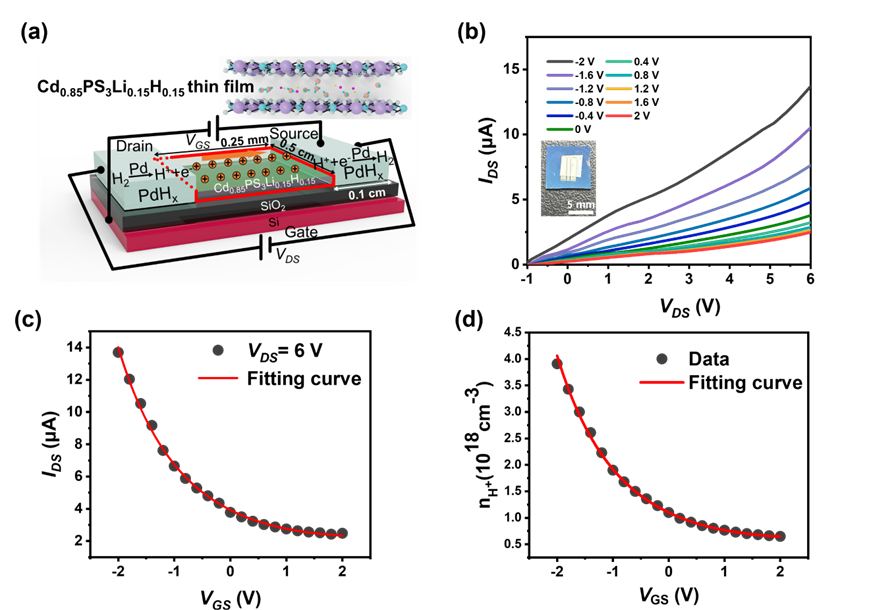 在电学特性方面,基于Cd0.85PS3Li0.15H0.15薄膜的质子晶体管展示了场效应迁移率达到8.84 × 10−2 cm²V−1 s−1,并实现了开关比5.51的优异表现,这一结果远超目前报道的绝大多数P-FET器件。此外,研究还表明,该器件在不同栅压条件下的质子浓度变化明显,表明其具有良好的电场调控能力,这对于在生物相关环境中的应用极为关键。