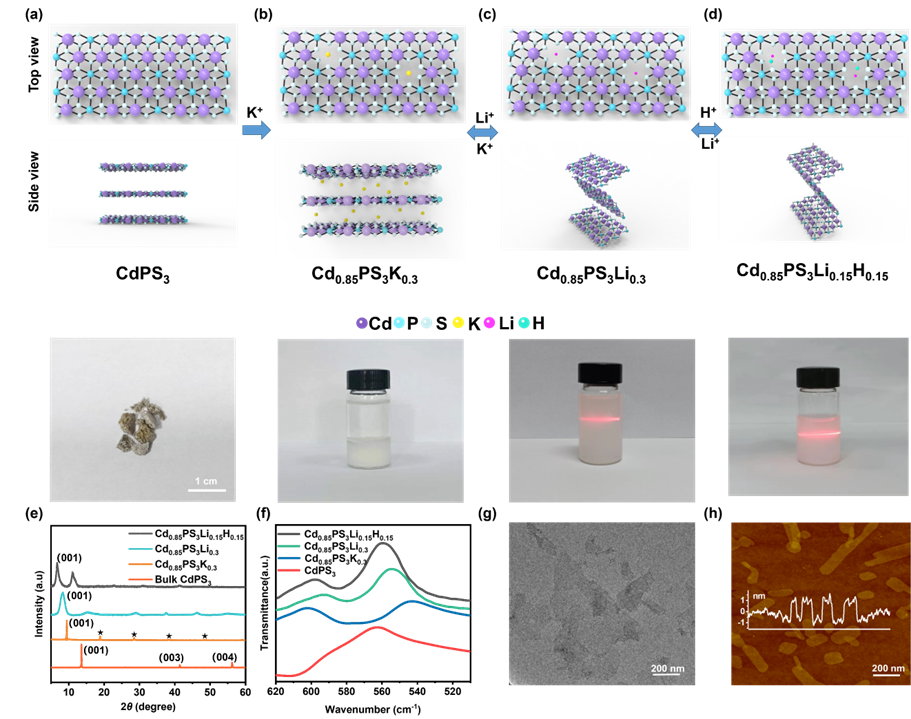 研究过程中,团队采用了独特的两步碱金属离子插层和离子交换方法,合成了具有Cd空位的Cd0.85PS3Li0.15H0.15超薄膜。该材料不仅具有1.02纳米的层间距,有助于质子在多重纳米通道和层间水网络中的快速迁移。Cd₀.₈₅PS₃Li₀.₁₅H₀.₁₅纳米片展现出超薄特性,透射电子显微镜(TEM)图像中表现出的低对比度便是有力证明。根据原子力显微镜(AFM)的测试结果,所合成的Cd₀.₈₅PS₃Li₀.₁₅H₀.₁₅纳米片厚度约为1.5纳米,表明这些纳米片主要为单层结构。