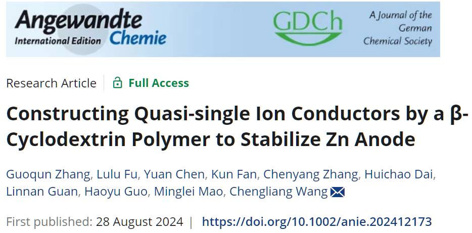 进而,课题组通过将环糊精聚合,获得了大面积环糊精薄膜,并将该薄膜用于保护锌负极,抑制了锌阳极的腐蚀。并且,通过环糊精与阴离子的主客体相互作用和氢键作用,有效地捕获阴离子,从而形成准单离子导体,提高了锌离子转移数,大幅提高了锌负极的寿命。相关成果以“Constructing Quasi-single Ion Conductors by a β-Cyclodextrin Polymer to Stabilize Zn Anode”为题发表在《德国应用化学》期刊上(Angew. Chem. Int. Ed. 2024, e202412173)。论文通讯作者是王成亮教授,共同第一作者是张国群和付路路。该系列工作得到了国家自然科学基金和湖北省创新群体等项目的支持。