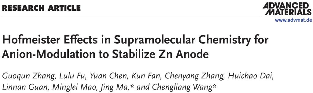 通过在电解液中引入环糊精添加剂,有效调控了锌离子的溶剂化结构,并揭示了不同环糊精对锌离子溶剂化的调控作用异同,有效提高了锌负极的稳定性,相关工作以“Regulating the solvation sheath of zinc ions by supramolecular coordination chemistry toward ultrastable zinc anodes”为题发表在《智能材料》期刊上(SmartMat 2024, 5, e1216)。张国群、陈远和付路路为论文共同第一作者,王成亮教授和南京大学马晶教授为共同通讯作者。进而团队研究了电解液阴离子对于锌负极的影响,并揭示了与环糊精作用力更强的阴离子有助于更有效地稳定锌负极的规律。相关工作以“Hofmeister Effects in Supramolecular Chemistry for Anion-Modulation to Stabilize Zn Anode”为题发表在《先进材料》期刊上(Adv. Mater. 2024, 36, 2405949)。张国群和付路路为论文共同第一作者。王成亮教授和南京大学马晶教授为共同通讯作者。