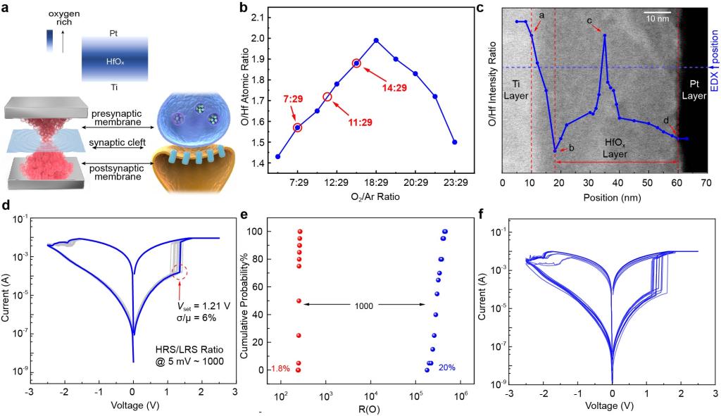 CMOS兼容的HfOx高k介质的氧空位缺陷可调控性强,通过调控镀膜过程中的氧氩比,得出HfOx薄膜中氧浓度随着氩氧比的增加呈现先增大后减小的趋势。基于此,在功能层的制备中,对氧浓度进行调控,使薄膜中氧浓度先增大后减小。如图1所示,对于制备好的器件,通过XPS和TEM对器件功能层的分析可以验证制备的多层HfOx忆阻器实现了氧空位沙漏型分布,即薄膜中氧空位数对称的先减小后增大,在施加电压时,器件的导电细丝通路会在中间薄弱层实现断裂和复合。对器件进行循环测试,器件实现了好的高低阻值循环特性,特别是器件低阻的差异系数仅为1.8%,随机选取多个器件单元进行测试,器件可以实现稳定的阻值循环一致性。