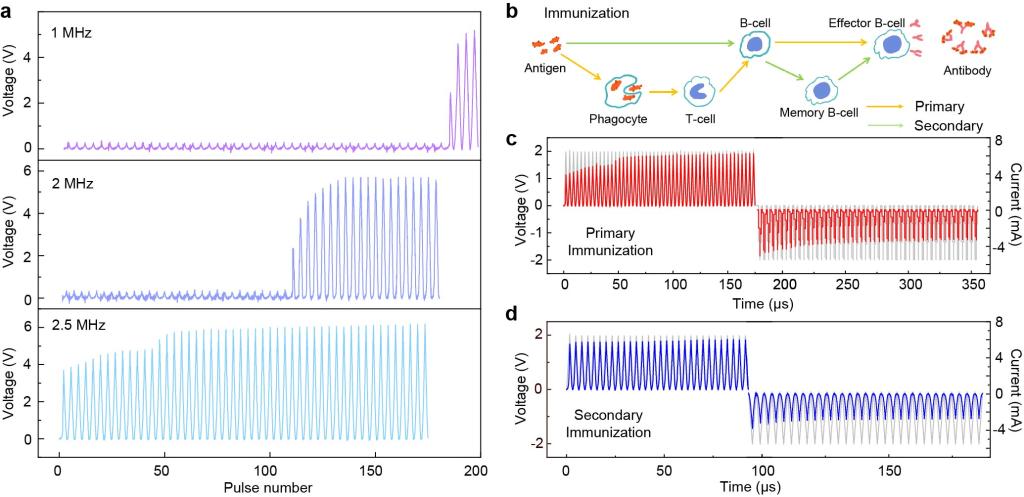 器件可以通过兴奋性和抑制性刺激来模拟生物免疫功能。免疫细胞具有记忆和识别先前遇到的病原体的能力,一旦超过特定阈值,淋巴细胞被激活并产生必要的抗体来中和抗原。如图4所示,我们分别在1 MHz, 2 MHz和2.5 MHz频率下施加50个脉冲。可以观察到,随着频率的增加,器件的响应速度也随之增加。当施加1 MHz和2 MHz的脉冲时,当脉冲累积到一定数量时,器件才会响应,这表明当外部病毒达到足以引起免疫系统注意的数量时,即达到淋巴细胞激活的阈值,才可以引起免疫反应。另一方面,当施加2.5 MHz的脉冲时,器件会立即响应,这表明不同病毒的感染能力不同,频率越高表明感染能力越强,从而更快地达到淋巴细胞激活阈值并触发免疫反应。基于此,器件也实现了对生物第一次免疫和二次免疫的模拟。