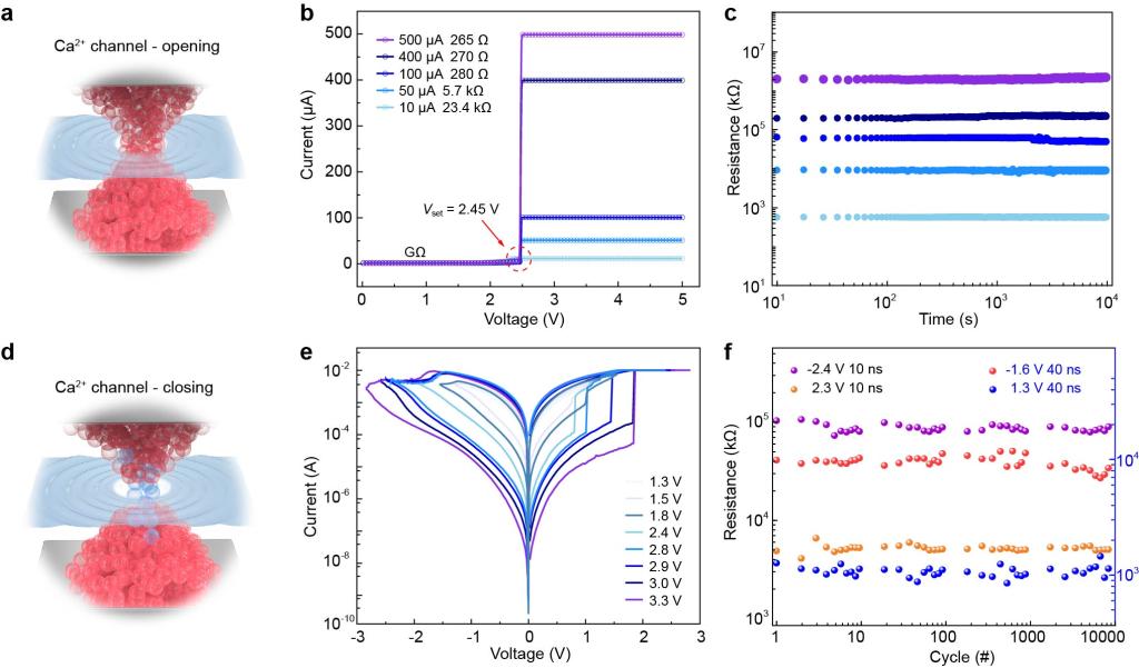 图2 器件实现电压门控Ca2+通道的打开和关闭图和器件性能表现图