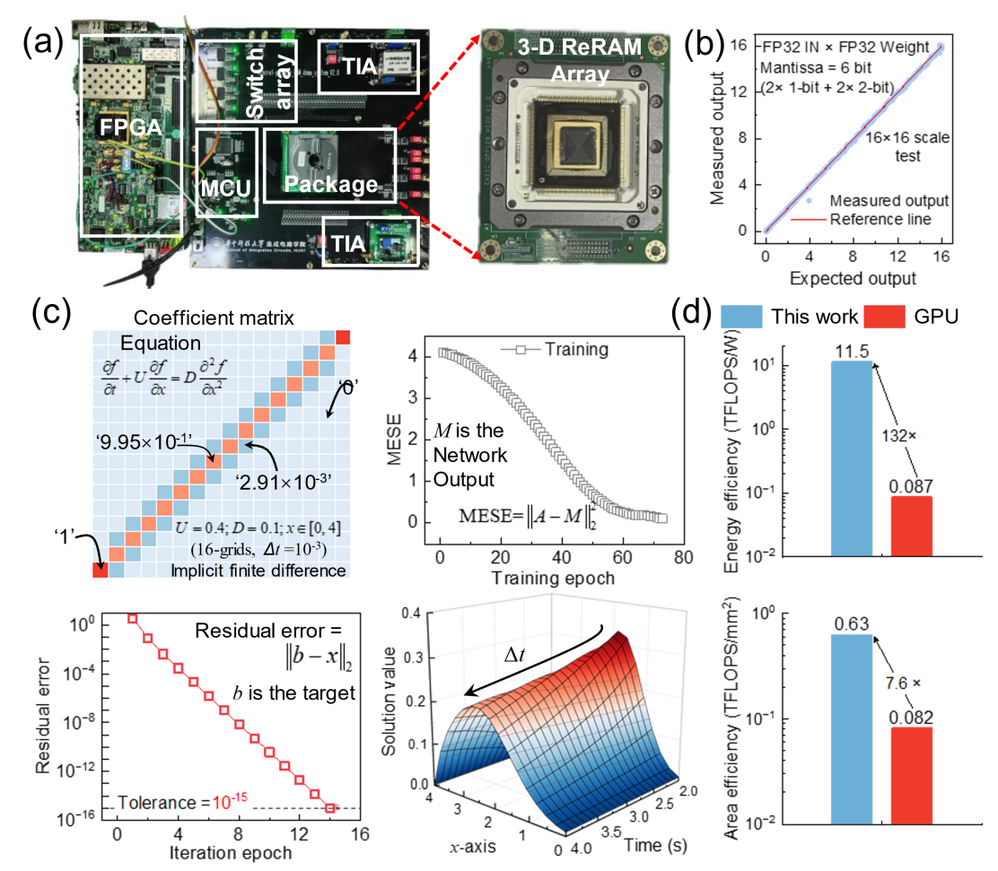 针对上述问题,团队构建了一套基于三维垂直堆叠的阻变存储器阵列(3D-V ReRAM)的存算一体神经网络训推软硬件系统,可以高效执行系数矩阵A的浮点精度逆运算及方程的浮点精度求解,并取得了以下进展: