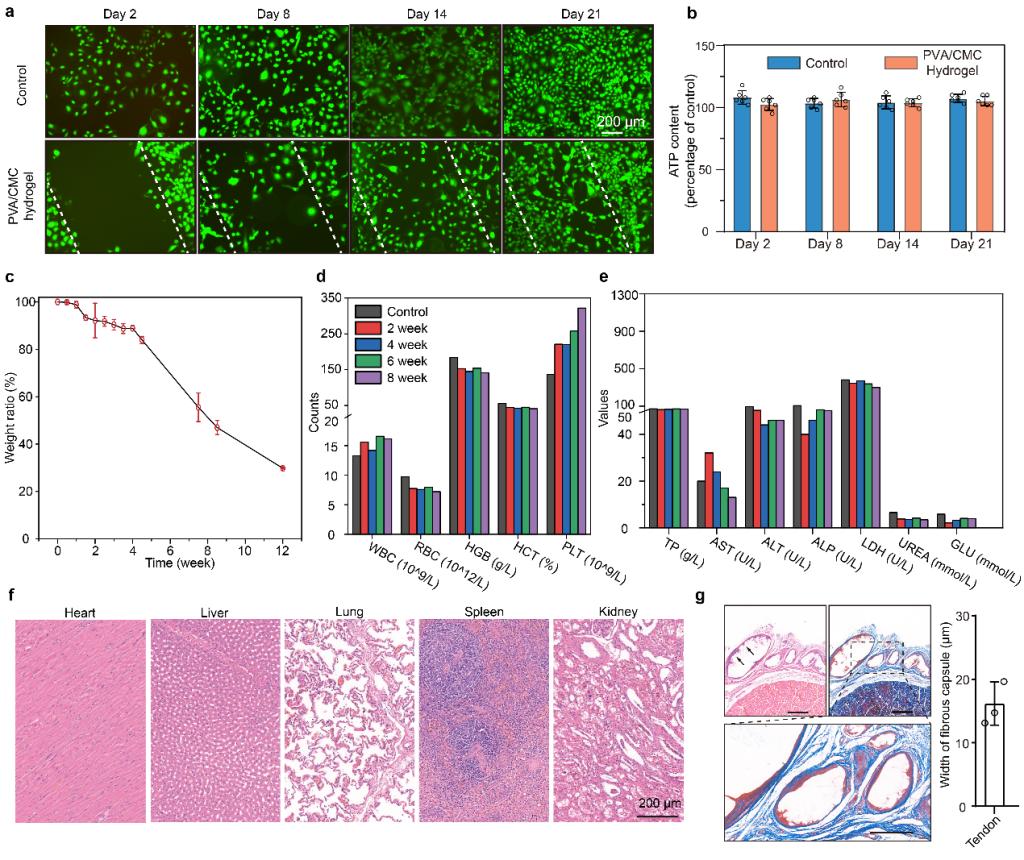 图7. 超凝胶应变传感器的生物相容性/可降解性能
