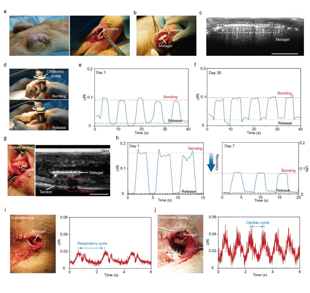 研究团队通过在猪体内进行为期30天的植入实验,成功监测到了肌腱拉伸、呼吸、心跳及伤口愈合等过程,验证了该器件的长期稳定性、生物相容性与可降解性。尤其值得一提的是,研究人员还将生长因子加载于Metagel中,实现了不同愈合速度下的伤口动态监测,展示出其在康复评估、药效评价、慢病管理等方面的广泛应用前景。