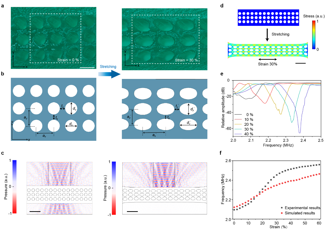 柔软可变形的超凝胶传感器仅由水凝胶材料和插入其中的空气孔结构组成,通过外部超声探头检测超凝胶的声学带隙频移来检测应变。