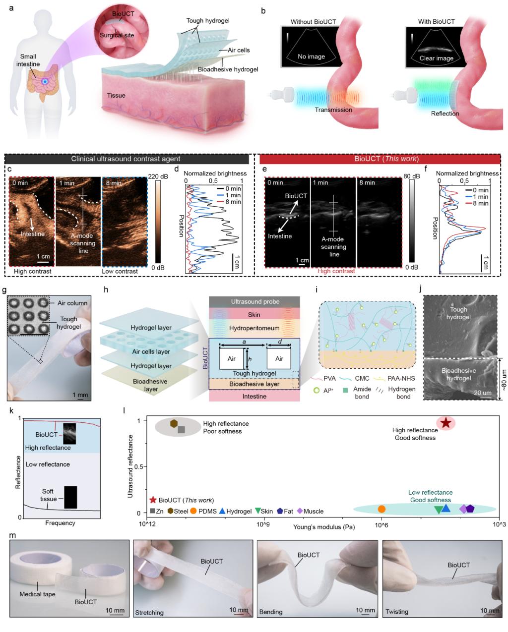 小肠切除术后常出现肠动力障碍和梗阻等并发症,需长期、定期监测。现有影像技术如MRI和CT虽分辨率高,但操作复杂、成本高昂且难以频繁使用;超声成像虽可实现无辐射、动态监测,但肠道等软组织回声微弱、位置不固定,成像对比度低。针对这一难题,研究团队提出了一种全新设计的可降解超声对比胶带(BioUCT),其通过在坚韧水凝胶中封装周期性气室结构,实现了超过90%的超声反射率,可显著增强肠道在超声图像中的显示亮度。