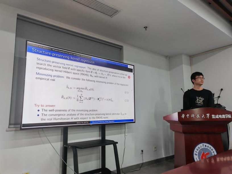 在机器学习方法的应用变得越来越广泛的今天,我们不仅需要在具体的应用层面(例如大语言模型、自动驾驶、材料仿真模拟)利用机器学习方法进行研究,也需要从数学的角度出发为“AI/ML for Science”奠定可靠的理论基础。胡建宇博士就基于自己近几年研究工作,为大家详细介绍了利用结构保持的核方法(kernel method),在给定有限数据集的情况下,如何模拟有关数据对应的哈密顿系统。报告从经典的有限维欧式空间中的哈密顿系统(如三维空间中的摆锤运动)的反问题求解开始,逐步推广到无穷维的辛流形与泊松流形的哈密顿系统以及量子情况下的含时薛定谔方程等系统的该类问题的解决。同时,报告还介绍了如何利用构造二次型的思路与正则化方法给出结构保持的核方法在处理哈密顿系统的反问题时的收敛性证明与解的唯一性证明。