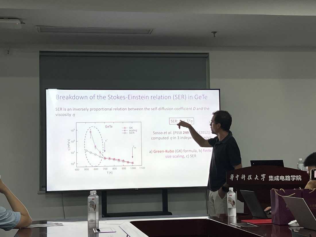 Riccardo Mazzarello教授首先简要介绍了相变材料在存储以及神经形态计算设备中的储值机制,即利用它们在晶态和非晶态之间进行快速可逆转变的能力,实现非易失性存储,在设备的工作条件下,这两相都十分稳定。而上述的这些性质意味着相变材料的结晶动力学具有很强的温度依赖性,这归因于其过冷液相的高度脆性。