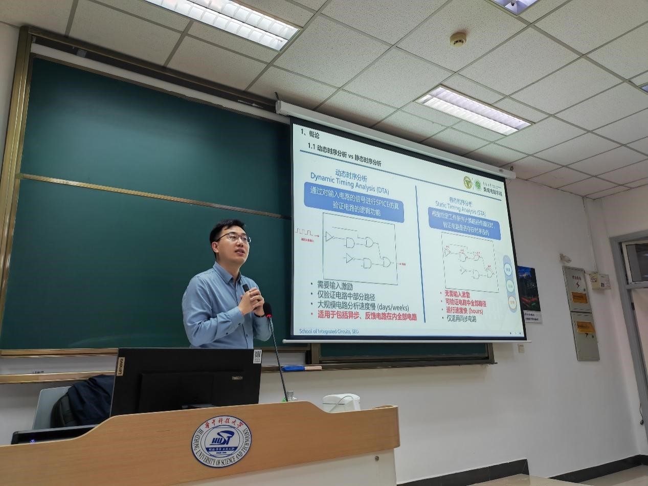静态时序分析(STA)是确保芯片功能和性能的核心验证手段,其本质是通过数学建模精确量化信号在电路中的传播延迟。在本次报告中,闫浩副教授聚焦STA在超大规模集成电路设计中的关键作用进行了讲解。报告首先介绍了,在单元延时建模方面,解析标准单元库中非线性延时模型(NLDM)与电流源模型(CCS)的物理实现原理,并对比了两者在亚微米工艺节点下的精度差异。随后,报告基于互连延时建模方面,梳理了从传统Elmore模型到基于模型降阶(MOR)的高效建模方法的技术演进,并结合先进工艺中长互连线的寄生效应,进一步讨论RC延时优化工程挑战与解决方案。