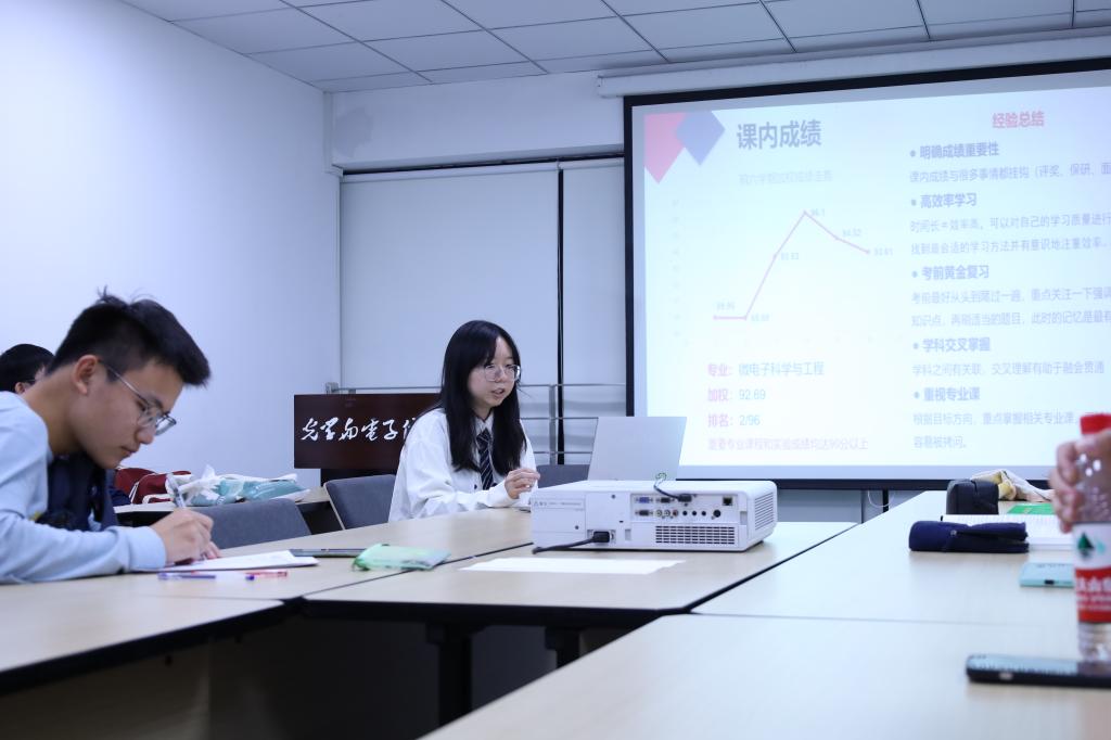 2023年国家奖学金获得者、电子2020级本科生第二党支部书记冯璐瑶同志先后来到电子信息类2307班和电子信息类2310班进行宣讲。从课业学习到员工工作、从科研竞赛到专业分流,冯璐瑶同学通过分享自身经历为同学们答疑解惑,帮助大家更好的适应老员工活,鼓励大家着眼长远、做好当下,避免内耗,好好生活,慢慢相遇。