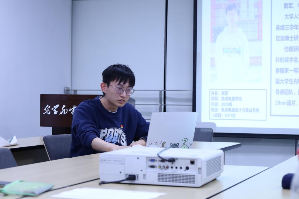 2023年国家奖学金获得者、集成2020级本科生第二党支部组织委员戴军同志从自身的大学本科阶段情况出发,着重就专业学习技巧和科研竞赛经验进行了分享。戴军建议同学们要注重课本学习与课件学习相结合,做好学习兴趣培养与学习氛围营造,积极体育锻炼,做到劳逸结合。鼓励同学们适度开展科研锻炼,迷茫时多多尝试,选择后贵在坚持。
