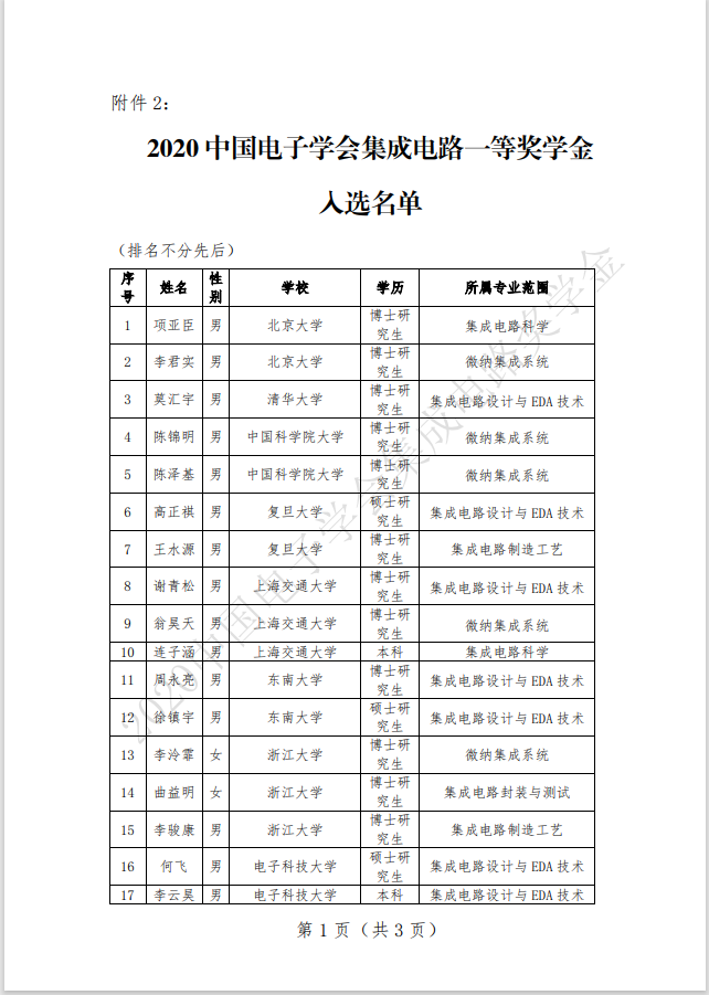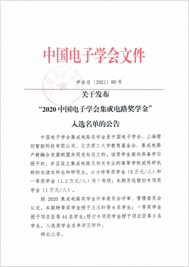 近日,中国电子协会公布了“2020中国电子学会集成电路奖学金”获奖者名单。公司陈佳博士荣获本期中国电子学会集成电路一等奖学金(全国仅44人)。