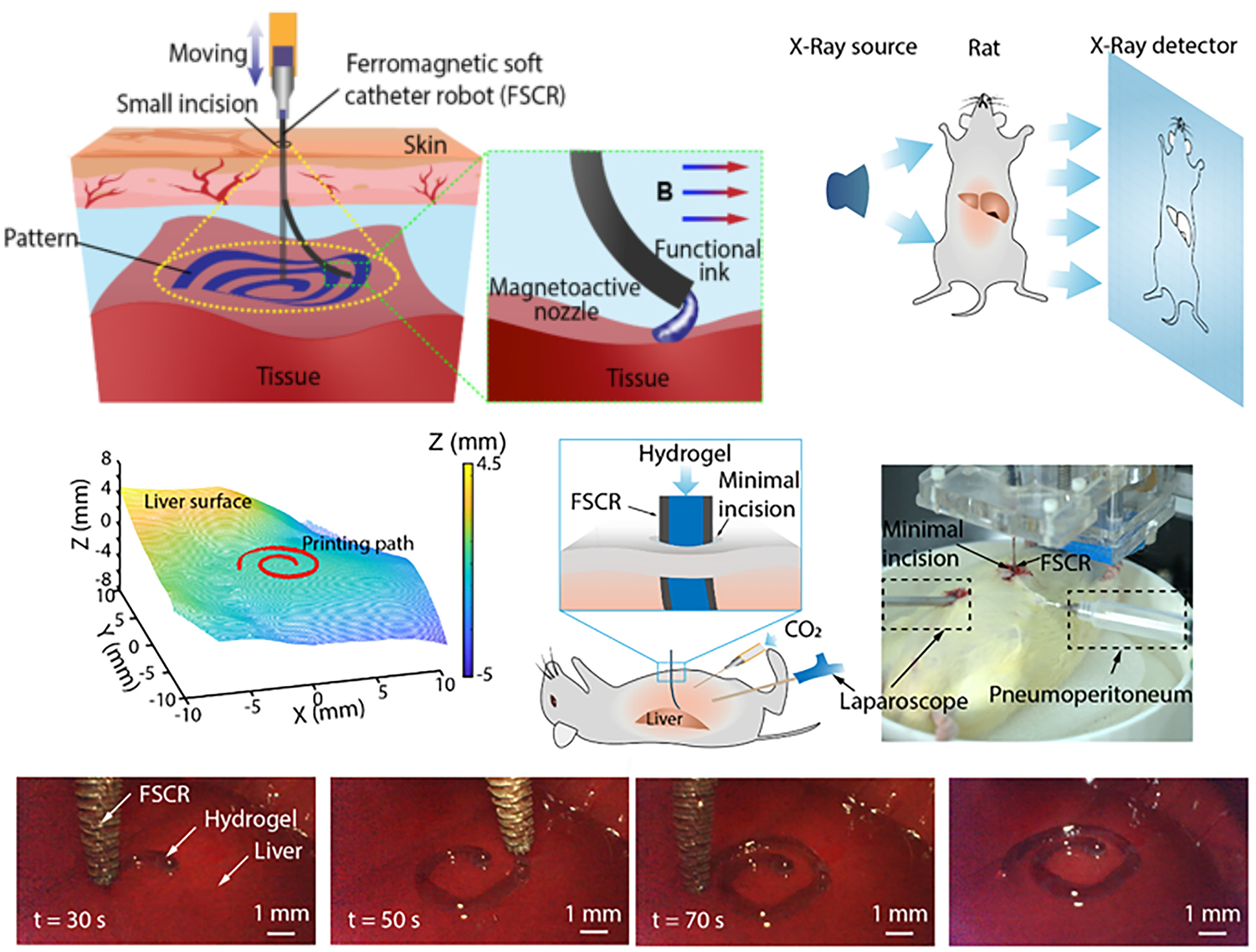 图1 用于微创生物打印的磁软导管机器人及其在实验鼠体内微创原位打印展示