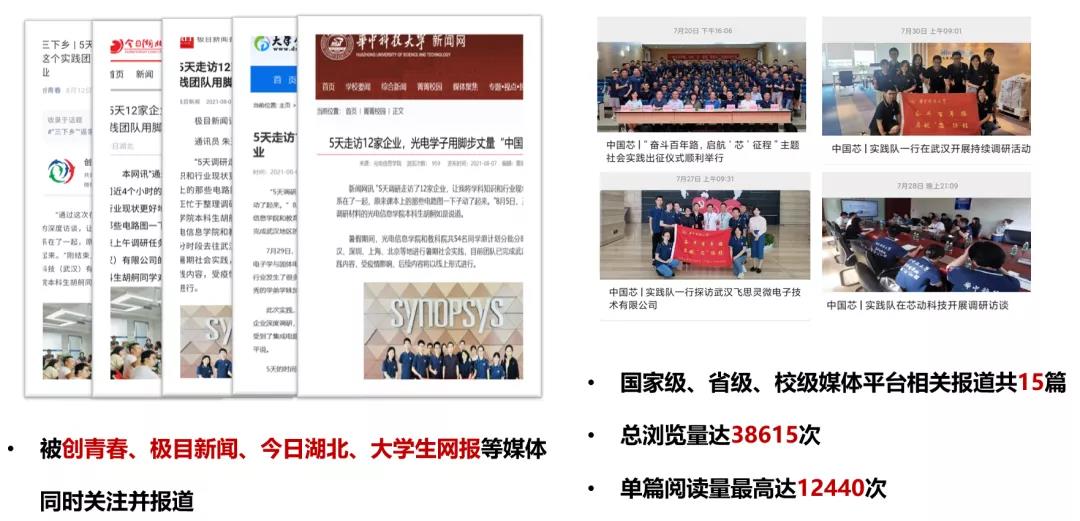 2021年“中国芯”暑期系列实践活动被创青春、极目新闻、今日湖北等媒体关注并报道,总浏览量近四万余次,广泛引发了社会关注。
