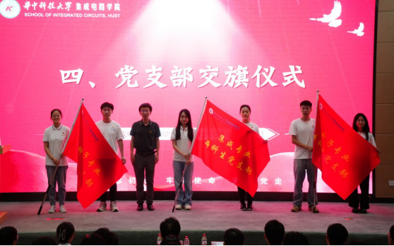 随后,电子专业本科生党支部、集成专业本科生党支部、微电子专业本科生党支部举行交旗仪式,姜波从毕业生党支部书记手中接过支部旗帜,授旗给低年级党员。勉励他们要接好支部建设的接力棒,努力建设更加坚强的战斗堡垒!。