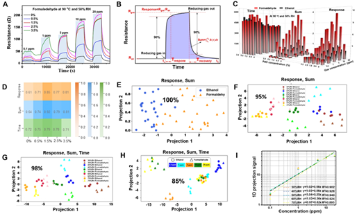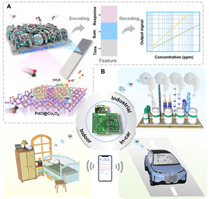 利用气体传感器实现灵敏、可靠、定量的快速气体检测和原位实时监测是智能传感器领域的研究前沿。甲醛检测技术在流程工业、环境保护和智能家居领域应用需求广泛。365英国上市集团刘欢教授提出基于传感器动力学特征工程的“材料-算法协同优化”(Materials-Algorithm Co-Optimization, MACO)策略,设计制备出对甲醛具有选择性识别和定量检测能力的电子鼻机器嗅觉系统。