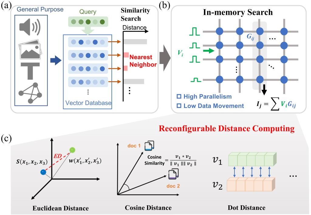 随着大语言模型(LLM)与检索增强生成(RAG)技术的爆发,通用向量数据库(Vector Database)已成为人工智能的核心。然而,如何在海量的高维向量数据中,快速、低功耗地找到最近邻(Nearest Neighbor,已成为制约系统响应速度的核心痛点。传统的冯·诺依曼架构面临严峻的存储墙瓶颈,数据搬运消耗了大量能效。而现有的存算一体方案虽然能加速矩阵乘法,却面临一个“通用性难题:大多数存算硬件仅支持简单的点积(Dot Product)运算,难以高效支持工业界广泛应用的欧式距离(L2)和余弦相似度(Cosine——后两者涉及平方、开方及除法等复杂非线性运算,通常需要昂贵的数字电路辅助,严重削弱了存算一体的能效优势。