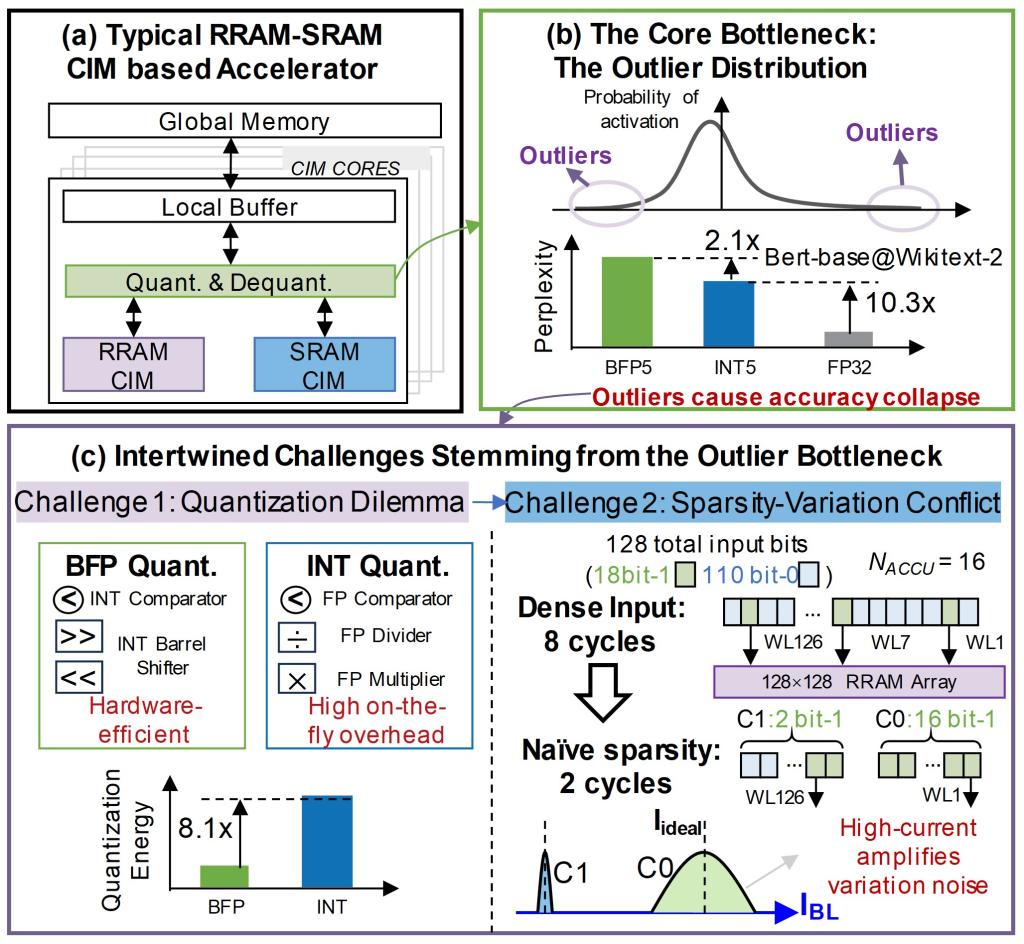 2 a)典型RRAM-SRAM存算加速器;(b)异常值是Transformer量化的核心瓶颈;(c)量化困境和稀疏-噪声矛盾。
