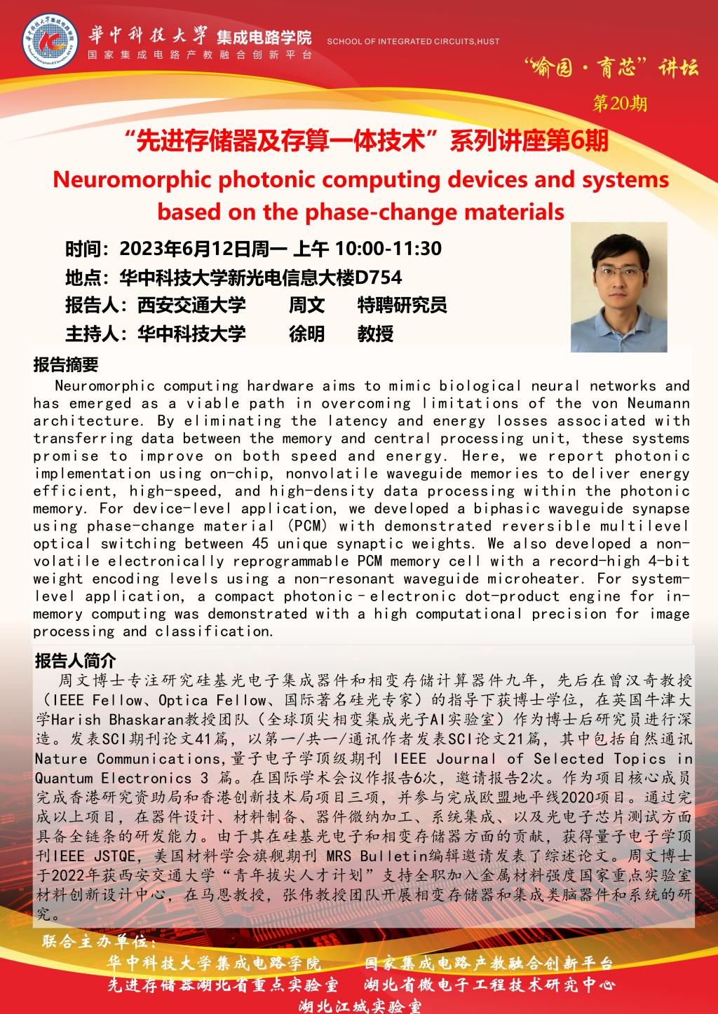 喻园•育芯讲坛第20期—“先进存储器及存算一体技术”系列主题讲座第6期:Neuromorphic photonic computing devices and systems based on the phase-change materials