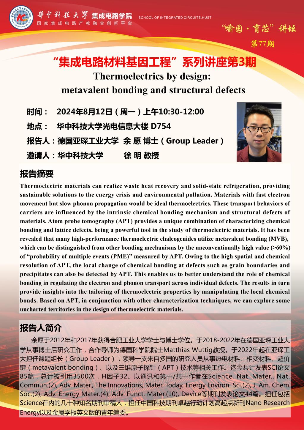 喻园•育芯讲坛第77期—“集成电路材料基因工程”系列主题讲座第3期:Thermoelectrics by design: metavalent bonding and structural defects