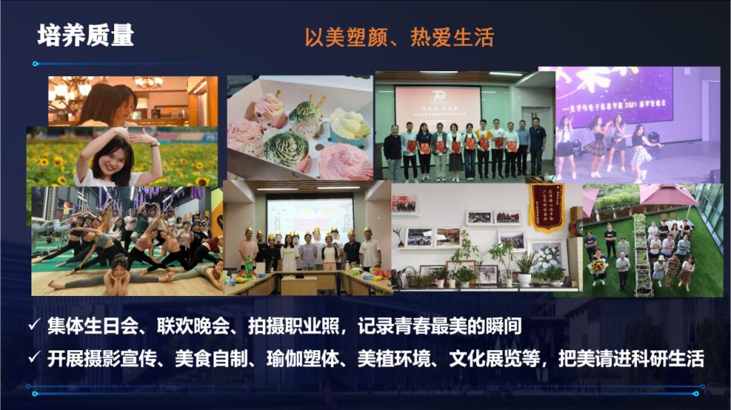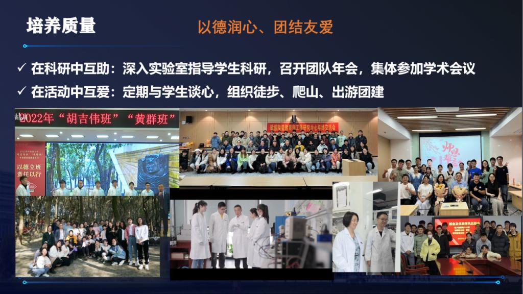 科研之外,五育并重是团队的一大特色。“以德润心”,在科研中互助,在活动中互爱,导师深入实验室指导员工科研,召开团队年会,集体参加学术会议;定期与员工谈心,组织徒步、爬山、出游团建。“以智慧内、积极进取”,组织举办全国与国际学术会议、邀请国内外专家、组内定期博士交流会,拓展视野。“以体强身、健康向上”,组织羽毛球、骑行、网球、篮球活动,举办运动会,为员工统一定做运动服,统一办理健身卡。“以美塑颜、热爱生活”,集体生日会、联欢晚会、拍摄职业照,记录青春最美的瞬间;开展摄影宣传、美食自制、瑜伽塑体、美植环境、文化展览等,把美请进科研生活。“以劳育品、勤劳奉献”,制定实验室卫生自查制度,在劳动中锻炼勤劳品质;采用实验室安全员工责任人轮流制度,在责任中培养奉献精神。