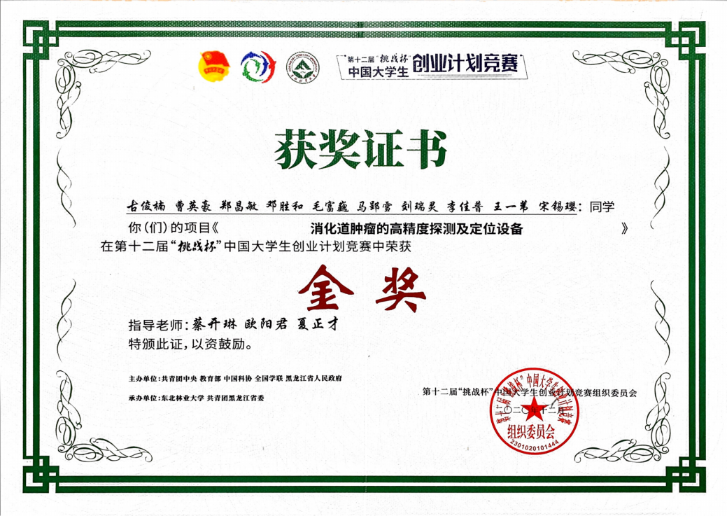 第十二届“挑战杯”竞赛国家级金奖获奖证书