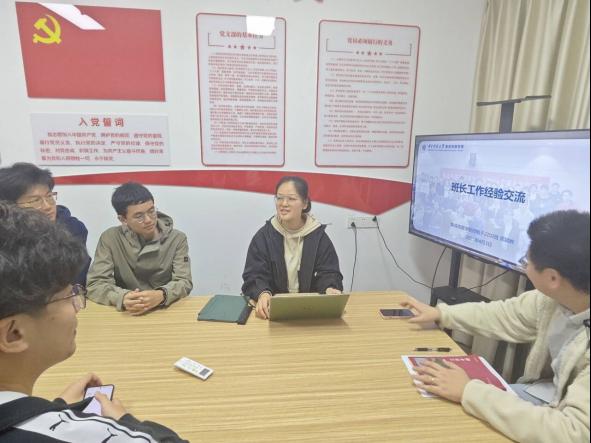 图为微电子专业本科生党支部周颖晔为低年级班级骨干分享班团组织建设经验