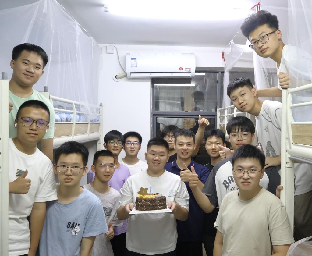 来到大学第一天过上生日怎么不算是双喜临门?8月30日晚,本科生辅导员吴义轩、研究生班主任刘亮岐前往新生宿舍,与班级其他同学一起,为当天过生日的彭同学送上了一份特别的惊喜与感动。