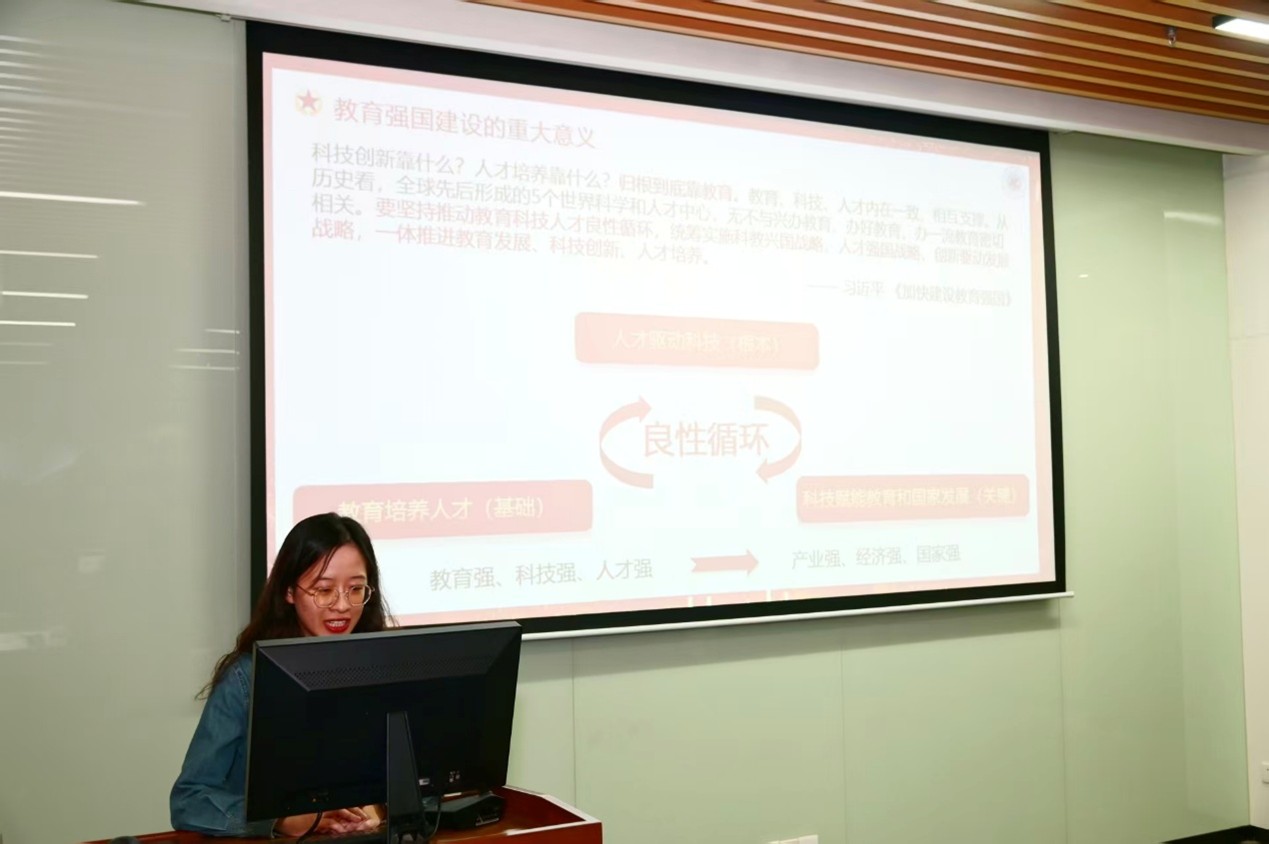 员工党员赖虹静围绕“学习习近平总书记关于教育的重要论述”进行专题分享。她系统梳理了习近平总书记关于教育强国重要论述的核心要义,强调教育是民族复兴的根基工程,结合公司“明德厚学、求是创新”的校训精神,号召党员同志要坚定理想信念,锤炼过硬本领,努力成为担当民族复兴大任的时代新人。