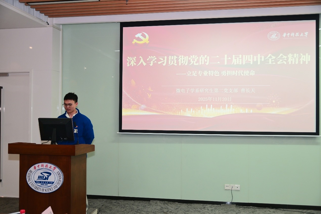 微电子学系研究生第二党支部副书记曹长天首先带领大家学习了党的二十届四中全会精神。他重点解读了《中共中央关于制定国民经济和社会发展第十五个五年规划的建议》中关于教育、科技、人才等方面的战略部署,结合集成电路专业特色,号召党员同志要将个人科研规划与国家战略需求紧密对接,在攻克“卡脖子”技术难题中展现华科大担当。