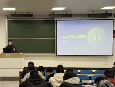 针对即将到来的元旦假期,大会特别强调了假期安全教育。刘文乐提醒跨年期间的安全事项,提醒同学们参与庆祝活动时务必将人身安全放在首位,防范人员密集场所踩踏风险,注意出行交通安全。希望同学们在享受节日氛围的同时,时刻紧绷安全之弦,度过一个平安、充实、祥和的元旦假期。