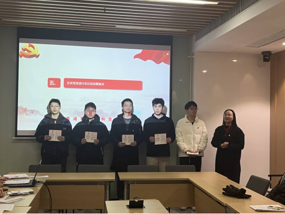 随后,会上讨论了汪辉龙、余敏实等5位同志的转正问题。经支委会讨论以及支部党员的监督,5位同志如期转为正式党员,并由辅导员杨傲寒为5名同志颁发政治生日贺卡。最后,杨傲寒老师对支部同志提出殷切期待,希望大家勇担使命,做有担当的集成人。